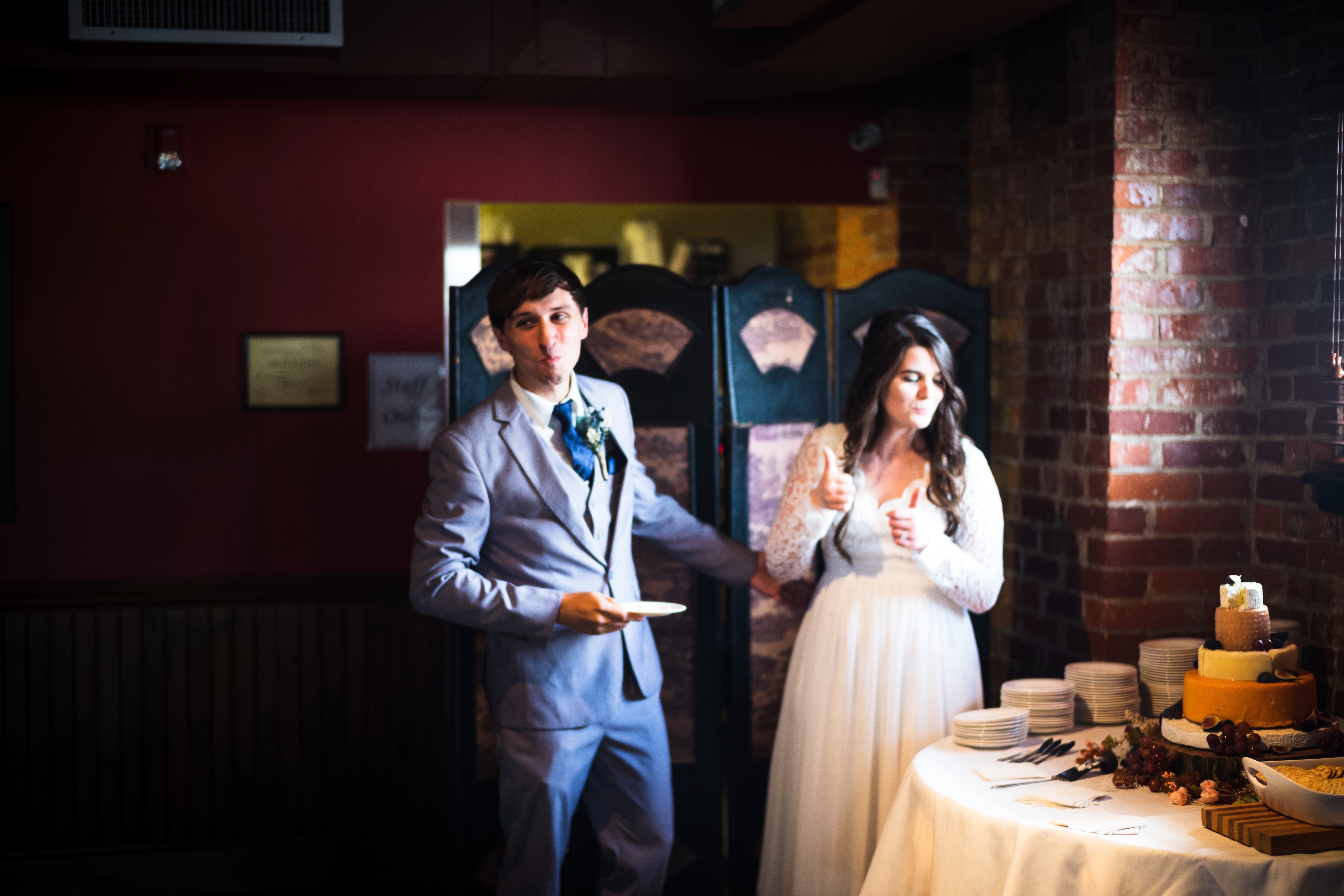 The photograph captures a light-hearted moment between a newlywed couple, illuminated by soft, warm lighting that enhances the intimate atmosphere. The groom, dressed in a gray suit, playfully poses with a plate, while the bride, in a flowing white dress, gives a thumbs up, radiating happiness and celebration. The rustic brick backdrop and elegantly arranged cake table set the scene for a joyful occasion filled with love and laughter.