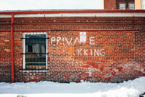 The photograph captures a brick wall emblazoned with the faded words 'PRIVATE PARKING,' asserting a sense of exclusivity amidst an urban landscape. Bright white snow contrasts sharply against the warm red brick, while the harsh lines of the barred window evoke a feeling of confinement. The overall mood is one of stark solitude, inviting contemplation on the meaning of ownership and access in modern spaces.