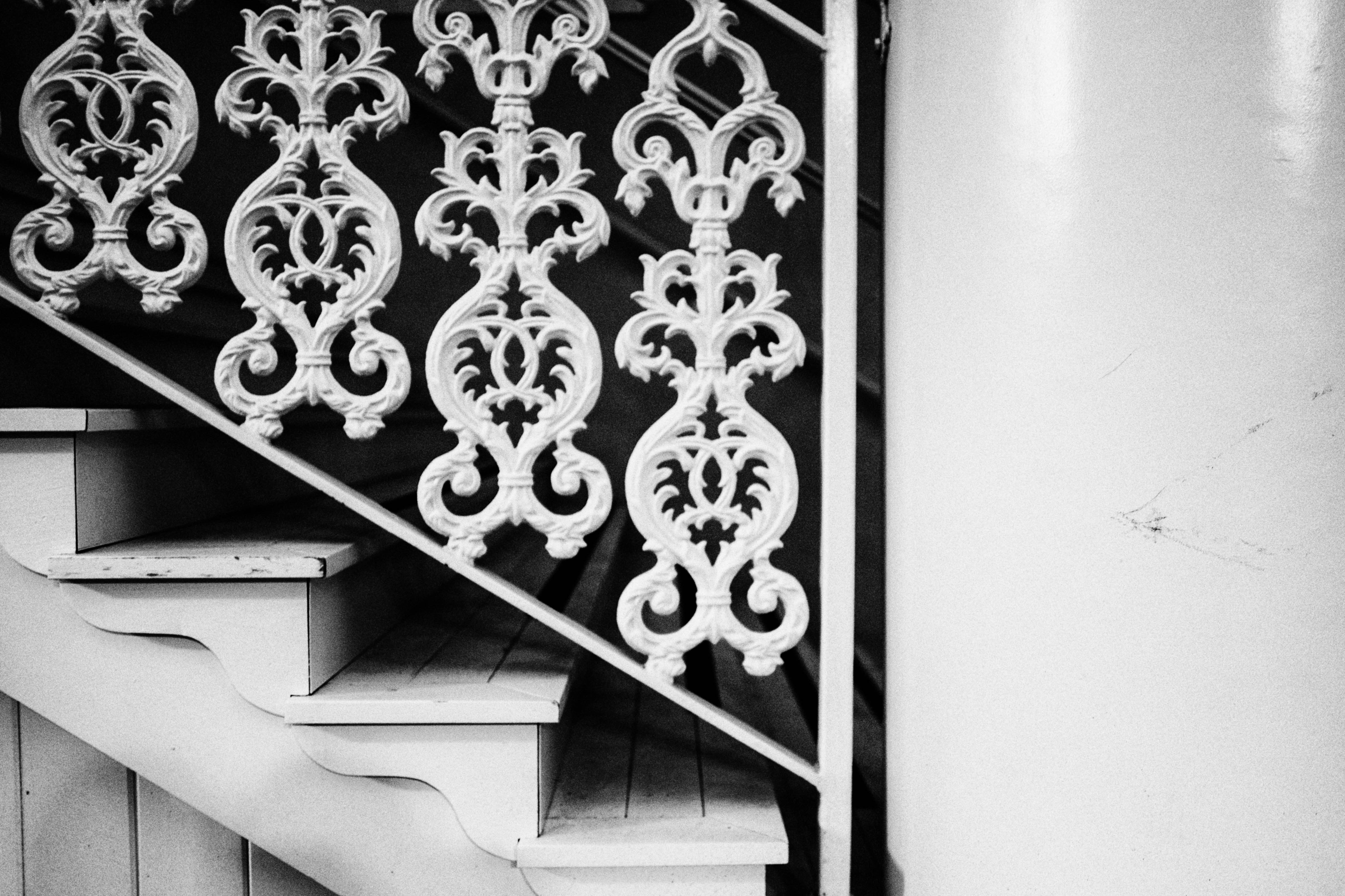 The photograph captures an ornate staircase with intricate white ironwork, leading upwards into shadowed space. Soft, diffused light creates a sense of intimacy and nostalgia, emphasizing the delicate patterns against the starkness of the black and white tones. The composition draws the eye along the steps, inviting viewers to imagine the stories hidden beyond the staircase's ascent.