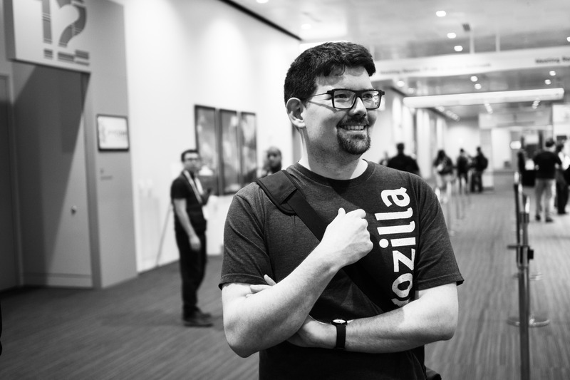 In this black-and-white photograph, a man in a Mozilla t-shirt stands casually with a warm smile, embodying a relaxed yet engaged atmosphere. The composition draws attention to him against a backdrop of softly blurred conference activity, with gentle lighting enhancing the sense of camaraderie. His thoughtful pose suggests a moment of reflection, bridging personal connection and the bustling environment around him.