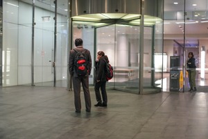 Two figures stand in front of a glass revolving door, their postures suggesting a moment of anticipation or indecision. The cool, sterile lighting highlights the sleek architecture, creating a modern yet somewhat impersonal atmosphere. Shadows and reflections add depth to the scene, enhancing the feeling of being on the threshold of a bustling urban environment.