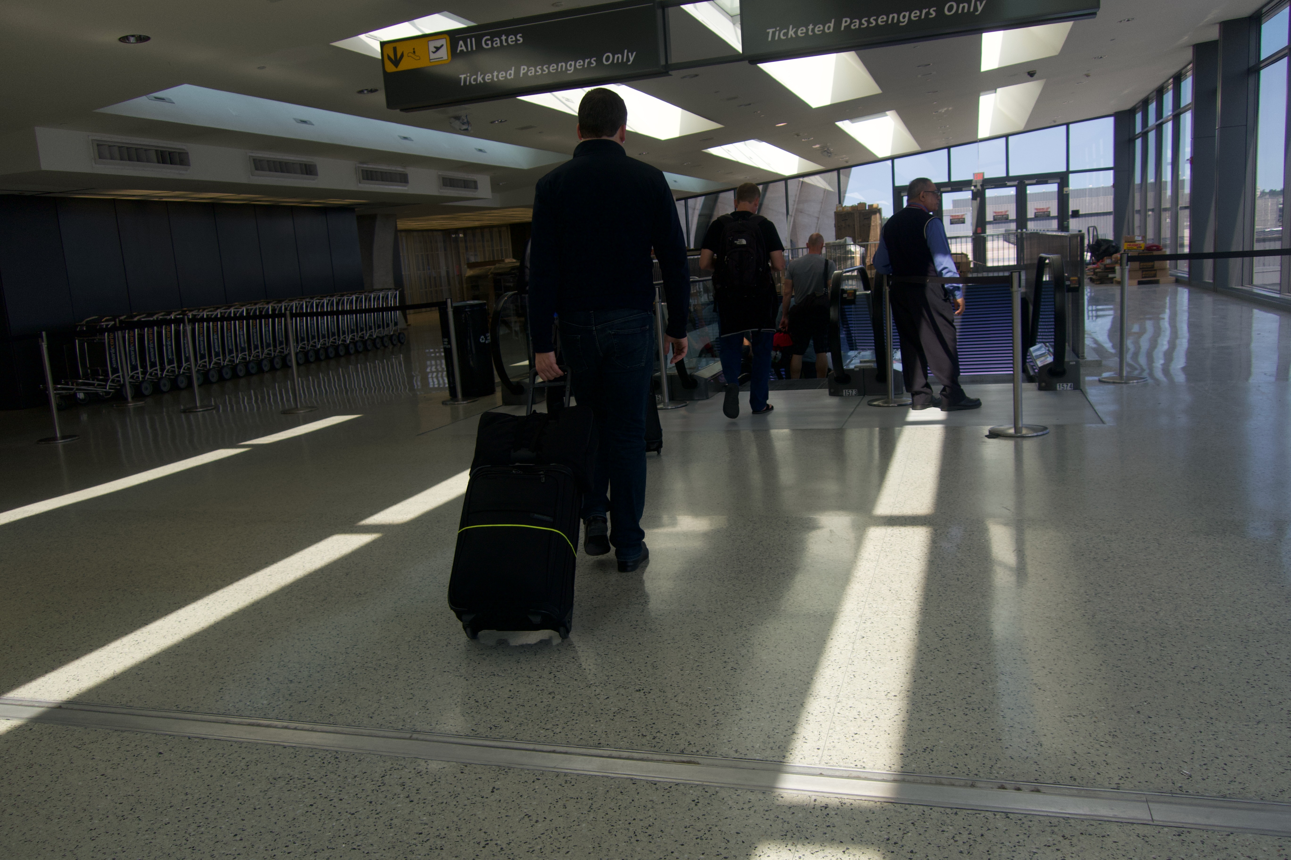 In this airport scene, a lone traveler pulls a suitcase while walking towards the security gates, flanked by fellow passengers. Natural light streams through large windows, casting dramatic shadows on the polished floor, creating a sense of movement and anticipation. The serene yet bustling atmosphere captures the essence of modern travel and the journeys awaiting beyond the gates.