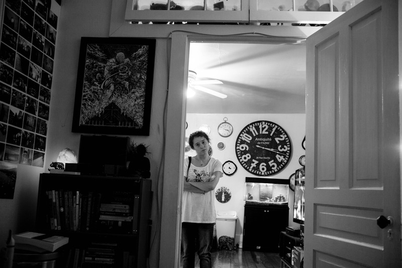 In this engaging black-and-white photograph, a young person stands with a contemplative expression at the threshold of a doorway, surrounded by an eclectic mix of clocks and artwork. The lighting is soft yet striking, casting gentle shadows that enhance the mood of introspection and curiosity. The composition draws the viewer’s eye through the open doorway, inviting exploration of the layered space beyond, rich with personal artifacts and memories.