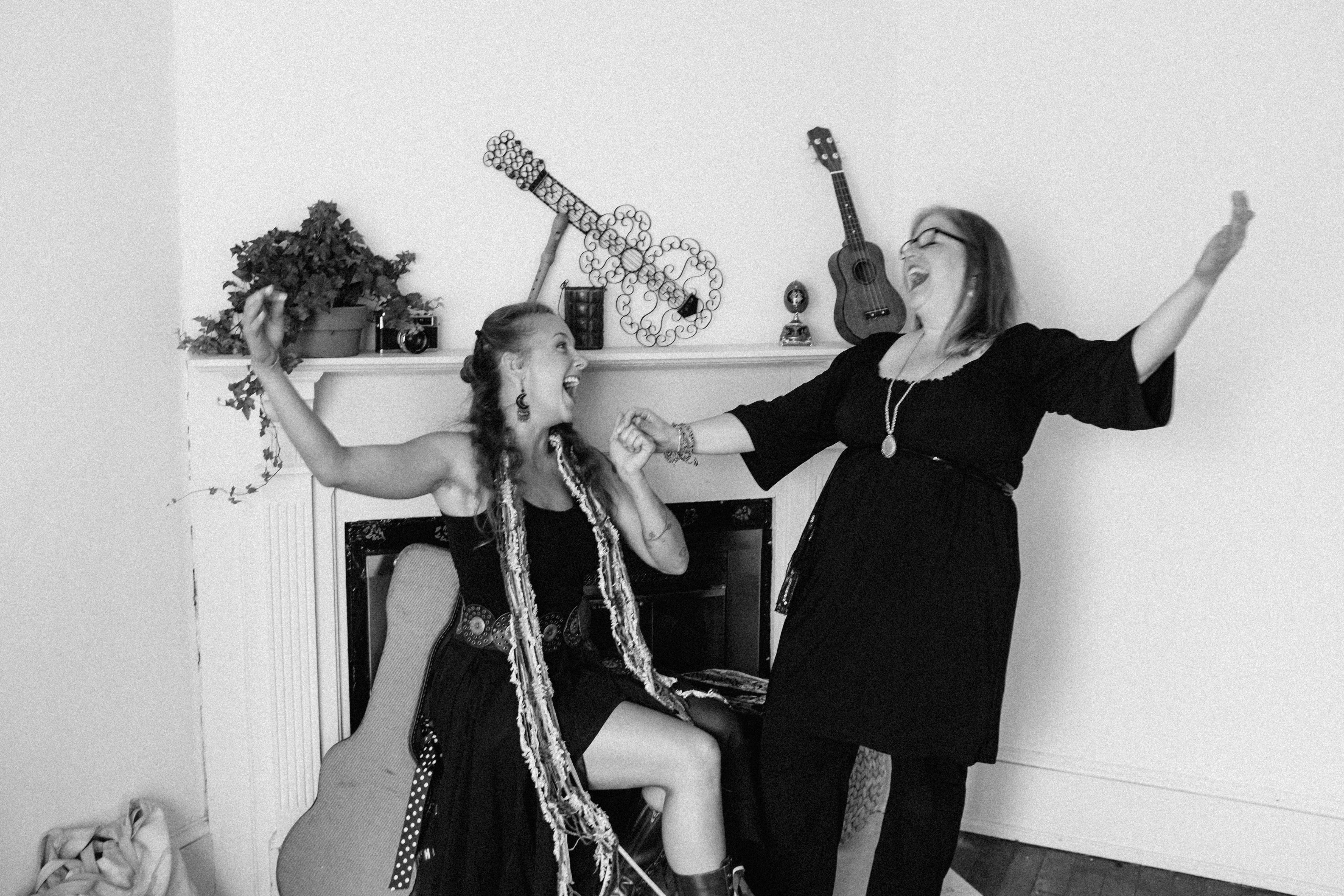 In a cozy, warmly lit room, two women celebrate a moment of connection through laughter and expressive gestures. Their playful energy fills the space, enhanced by musical instruments in the background, evoking a sense of joy and camaraderie. The black-and-white composition adds a timeless quality, highlighting their vibrant personalities and the genuine happiness they share.
