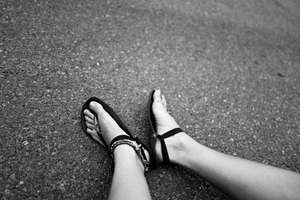 In this monochromatic photograph, two pairs of feet in sandals rest on a textured asphalt surface, creating a sense of relaxed simplicity. The intimate perspective invites viewers to contemplate stillness and connection to the ground beneath. Soft natural light casts gentle shadows, enhancing the peaceful mood of the moment, reminiscent of a lazy summer day.
