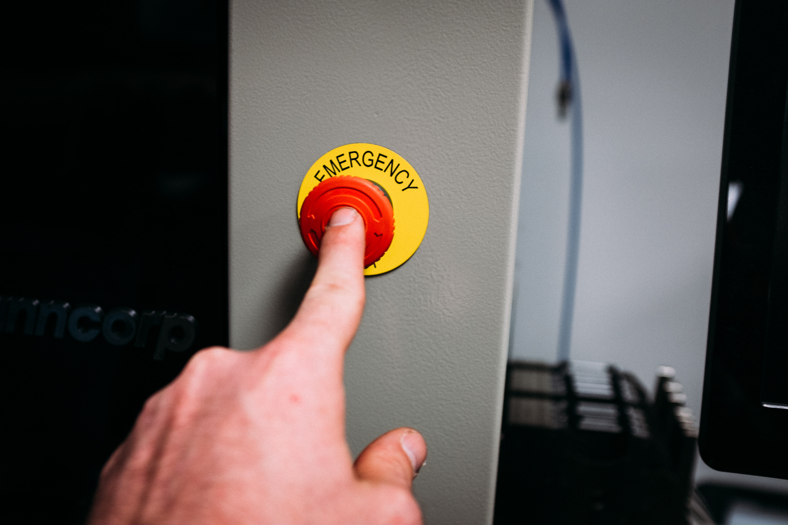 A hand poised above a bright red emergency button encapsulates a tense moment, highlighting the weight of choice in crisis. The sharp contrast of the button against a muted background creates a focal intensity, emphasizing the urgency. Soft, even lighting reveals the texture of the hand and the mechanical surfaces around, enhancing the atmosphere of impending action.