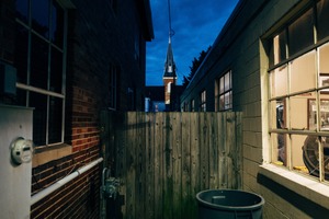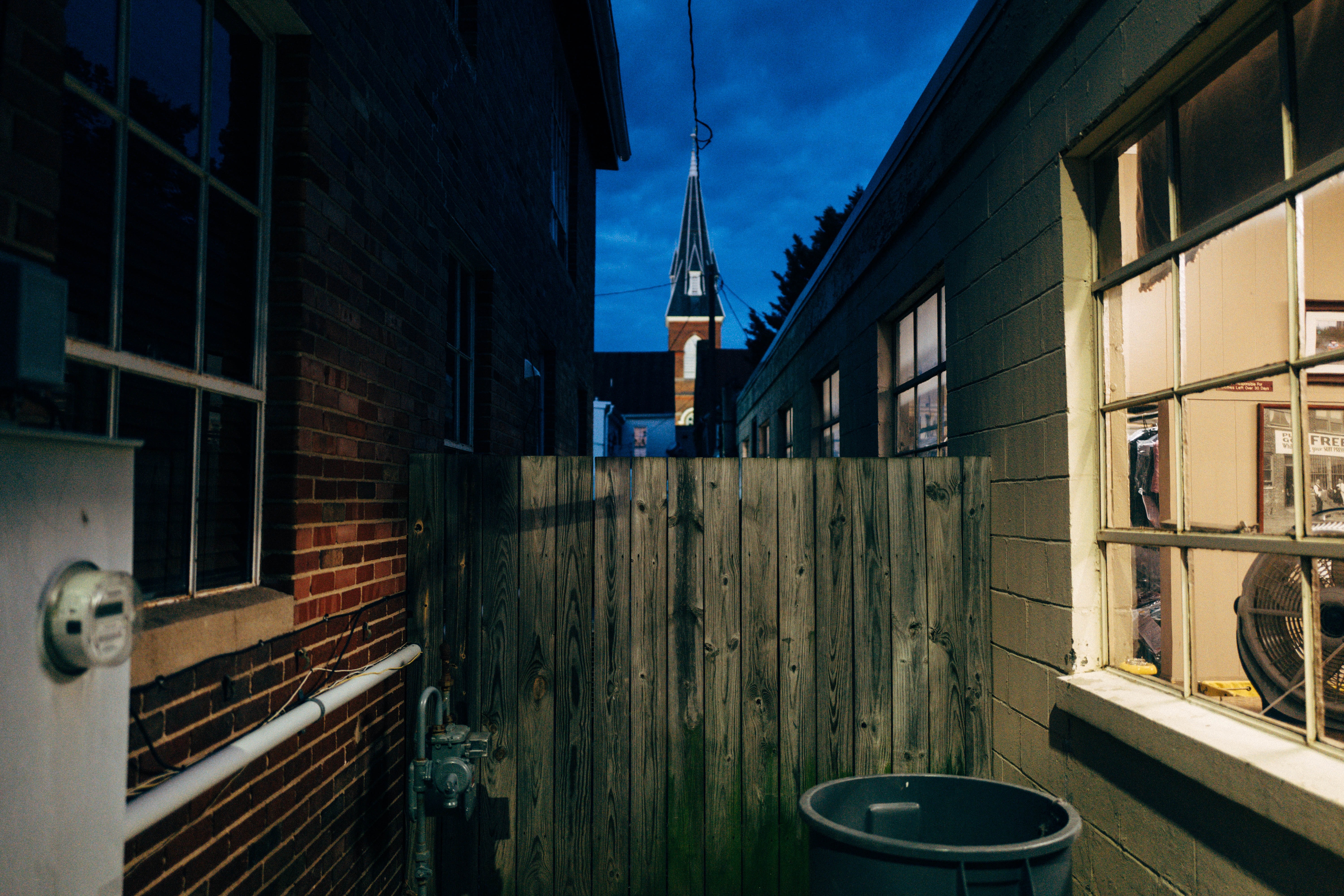This photograph captures a narrow alleyway at dusk, where the dim, cool blue of twilight contrasts with the warm, inviting light spilling from a window. A weathered wooden fence frames the scene, directing the viewer's gaze towards the spire of a distant church, adding a sense of depth and intrigue. The overall mood is both serene and somewhat mysterious, evoking a quiet moment in an urban landscape.