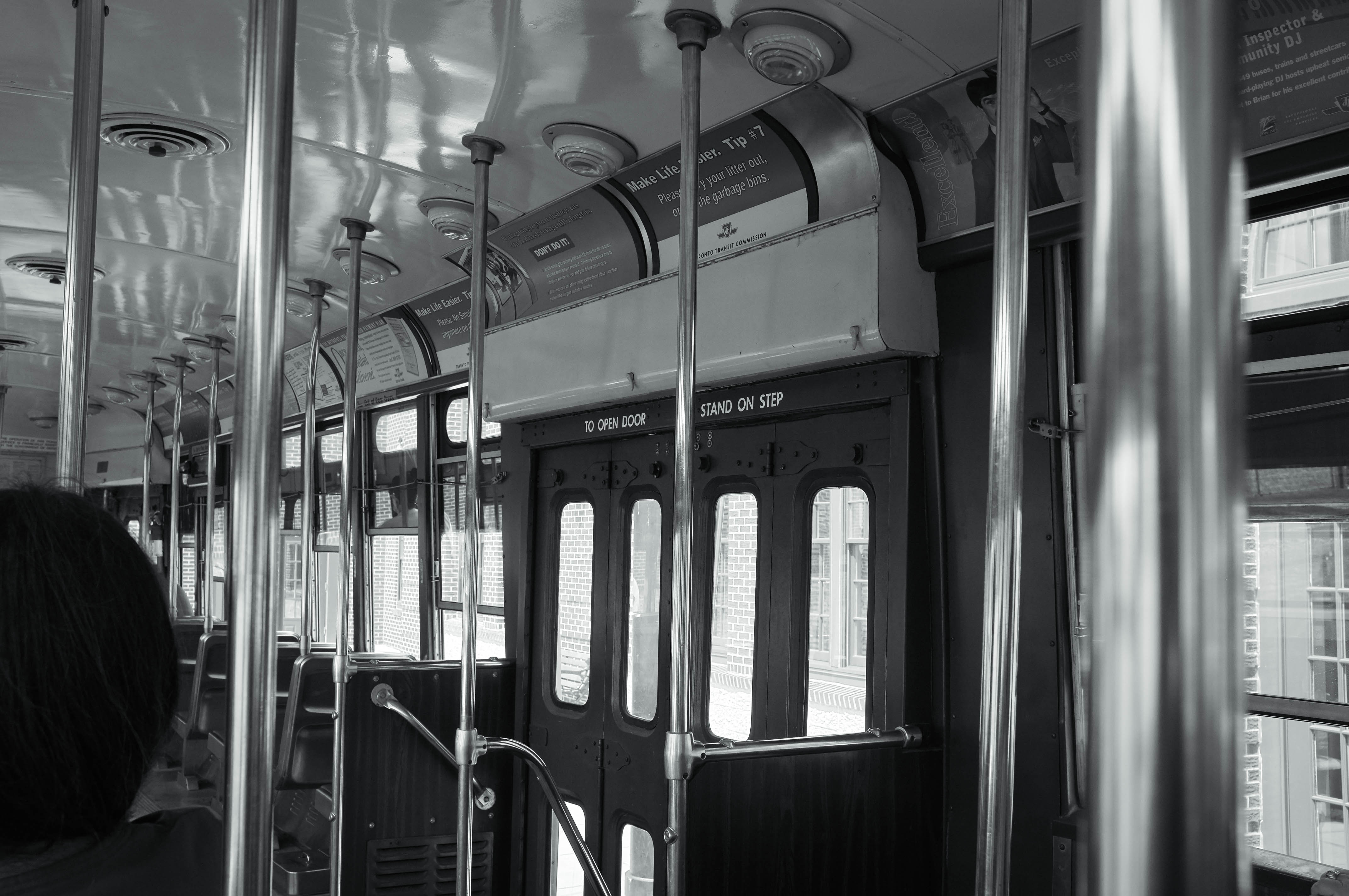This black-and-white photograph features the interior of a vintage bus, where metal poles and empty seats create a sense of nostalgia. The soft lighting casts reflective glints on the polished surfaces, evoking a serene yet slightly melancholic mood. The composition draws the viewer's eye toward the open door, hinting at journeys yet to be taken.
