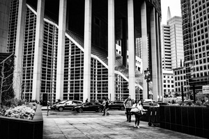 This photograph captures a bustling city scene framed by towering modern architecture, showcasing a dynamic interplay of lines and shapes. The stark black-and-white composition enhances the mood of urban life, while reflections in the glass create a sense of depth and complexity. Figures move purposefully through the scene, emphasizing both the loneliness and camaraderie found in a vibrant metropolis.
