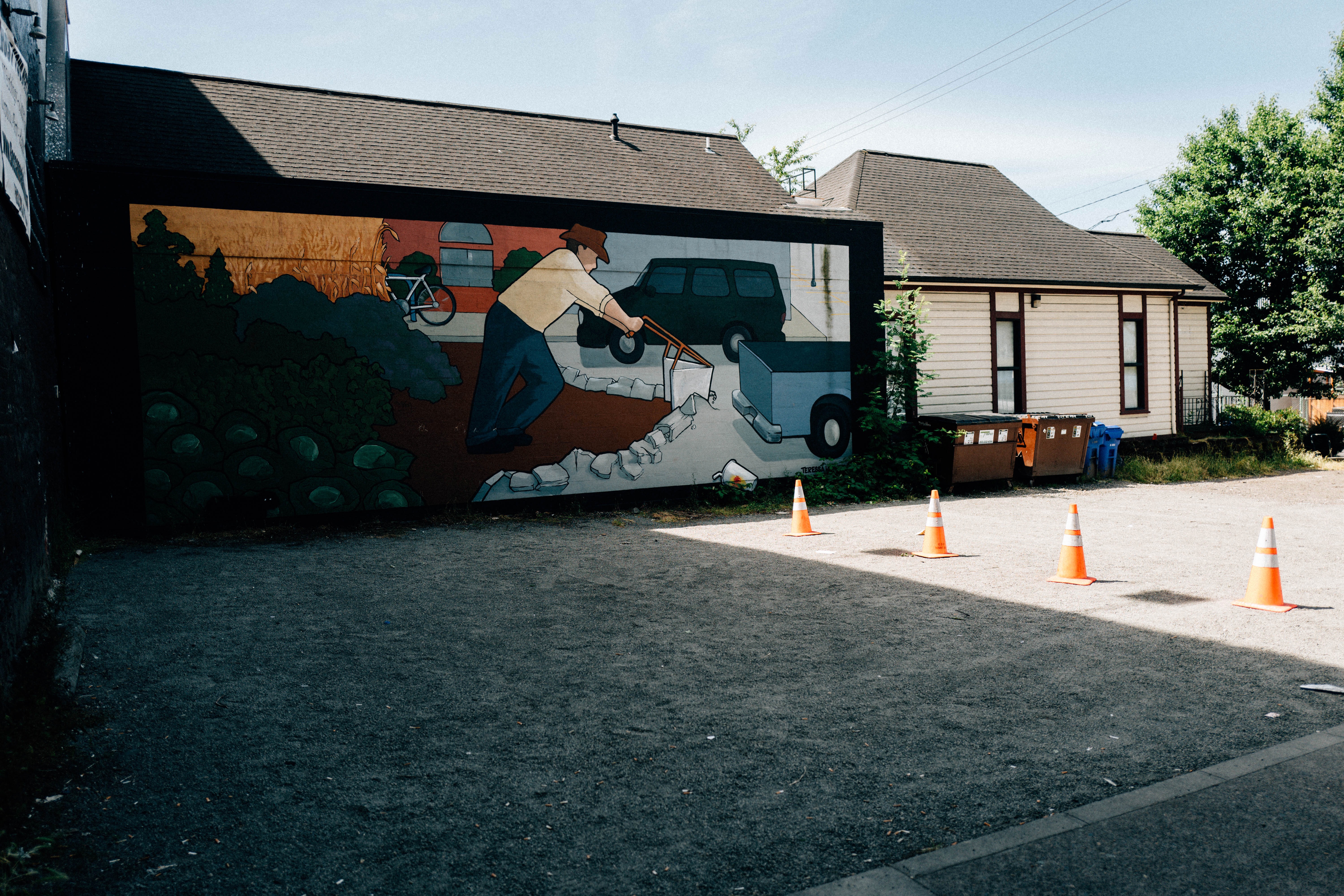 A vibrant mural showcasing a farmer tilling the soil adds color to an otherwise stark alleyway. The bright midday sun casts soft shadows, enhancing the rich hues of the artwork, while orange cones delineate the space, hinting at the juxtaposition of urban life and agricultural homage. The surrounding buildings suggest a blend of history and modernity, creating a reflective mood about community and labor.