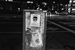 In stark black and white, a weathered utility box stands prominently in an urban landscape, adorned with graffiti and a quirky event poster. The contrast between the illuminated background and the dimly lit foreground adds a sense of mystery and nostalgia, while the vibrant poster injects a playful energy into the gritty scene. Streetlights twinkle in the distance, creating an atmospheric backdrop that highlights the box as a canvas of urban life.