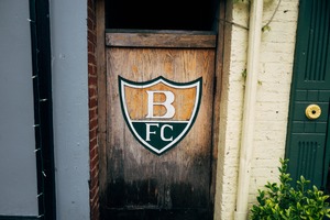 The photograph captures a weathered wooden door featuring a bold emblem of 'B FC', a symbol of sporting pride. Natural light softly illuminates the details, emphasizing the rustic texture of the wood and the vibrant colors of the logo. The surrounding environment, with hints of foliage and brick, enhances the feeling of nostalgia and community spirit.