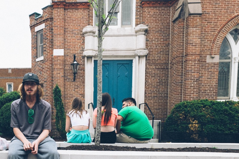 The photograph captures a moment of casual interaction outside a historic brick building, featuring a group of friends lounging together. The mood is relaxed and informal, highlighted by soft, diffused lighting that enhances the muted colors of their clothing and the surrounding greenery. A lone figure sits in the foreground, creating a dynamic contrast with the more intimate group in the background, framing the scene with a subtle sense of solitude amidst camaraderie.