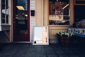 The photograph captures a quaint storefront scene, with a vintage mirror propped against a wall reflecting a bright sky dotted with fluffy clouds. The rich textures of the brick and wood create a warm, inviting ambiance, while the vibrant flowers in a basket add a touch of freshness. The overall composition balances elements of architecture and nature, evoking a sense of nostalgia and tranquility in an urban setting.
