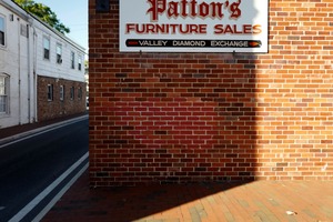 This photograph captures a brick wall adorned with a vintage sign for Patton's Furniture Sales, evoking a sense of nostalgia. The warm morning light casts soft shadows across the textured bricks, creating an interplay of light and shadow that enhances the inviting yet quiet mood of the street. The composition is balanced, with a hint of the tranquil road and charming building peeking into the frame, inviting the viewer to explore further.