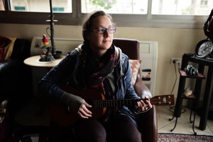 A young woman sits comfortably in a cozy living space, strumming a ukulele with a contemplative expression. Natural light filters through the window, creating a warm, inviting atmosphere that enhances the intimate mood of the scene. The surrounding decor speaks to a personal touch, with eclectic furnishings that convey a sense of home and creativity.