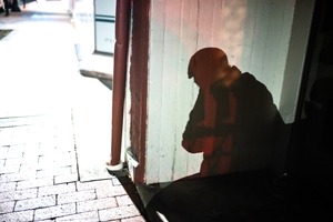 The photograph captures a solitary figure cast in shadow against a weathered wall, creating an atmosphere of introspection and solitude. The dramatic lighting juxtaposes the bright street with the somber tones of the shadow, accentuating the mood of contemplation. The urban setting, with its sharp lines and contrasting light, adds depth to the scene, inviting viewers to ponder the story behind the figure.