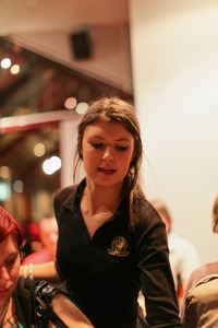 A young woman in dark attire leans slightly forward, her focused expression capturing the essence of dedicated service. The warm, ambient lighting creates an intimate atmosphere, enhancing the vibrancy of the gathering around her. The soft bokeh effect in the background hints at lively conversations and the bustle of a lively setting, adding to the overall engaging mood.