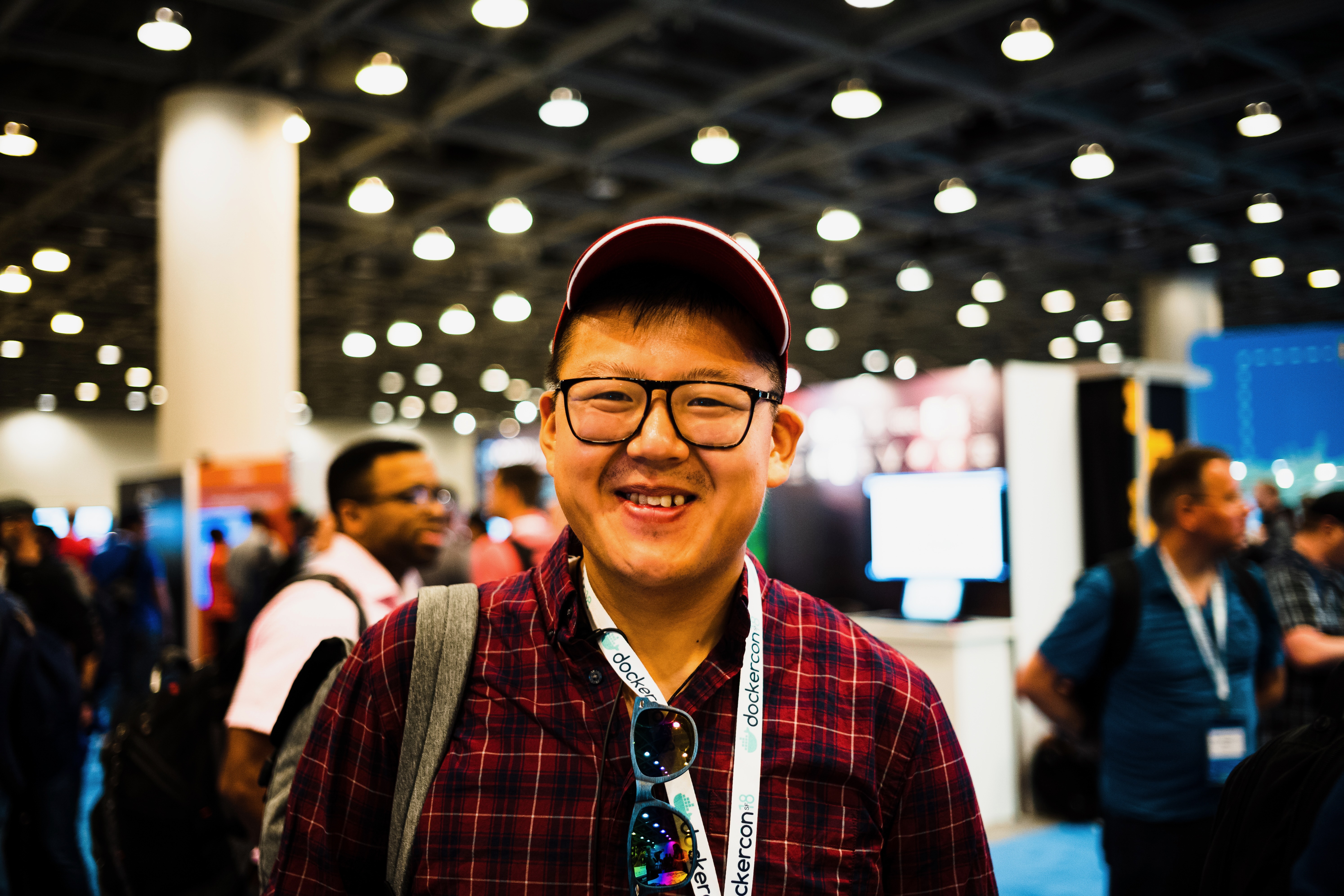 A young man with a wide smile stands in a bustling convention center, exuding warmth and friendliness. He wears a plaid shirt and a baseball cap, while a lanyard around his neck suggests a sense of belonging in this vibrant environment. The soft lighting and blurred figures in the background enhance the lively atmosphere, capturing the excitement of the event.