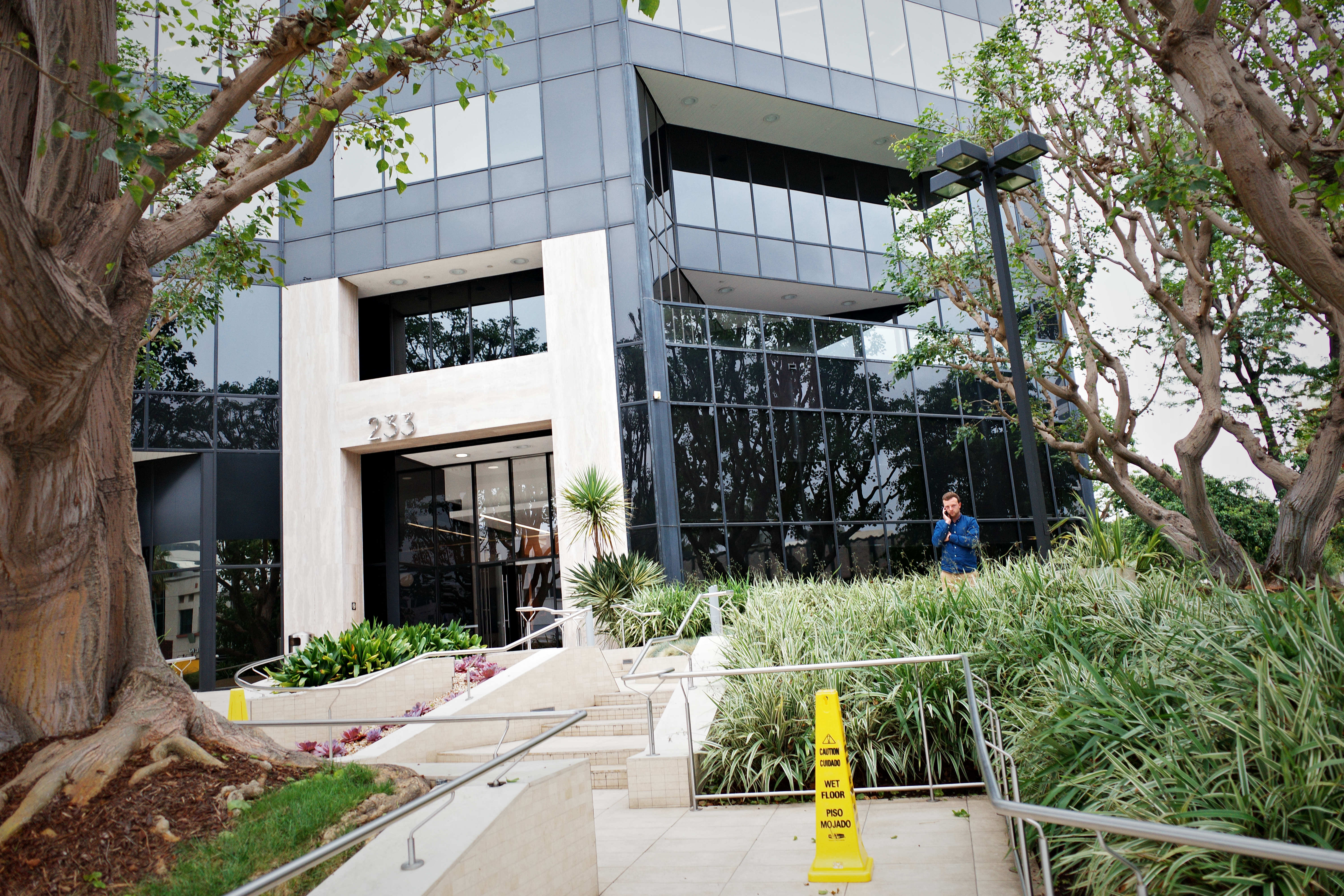 The photograph features a sleek modern office building framed by lush greenery and a large tree, creating a contrast between nature and architecture. The subdued lighting lends a calm atmosphere, while a lone figure stands contemplatively by the entrance, highlighting a sense of solitude amidst the urban setting. The composition leads the eye through the carefully arranged pathways and around the vibrant foliage, inviting viewers to explore the space.