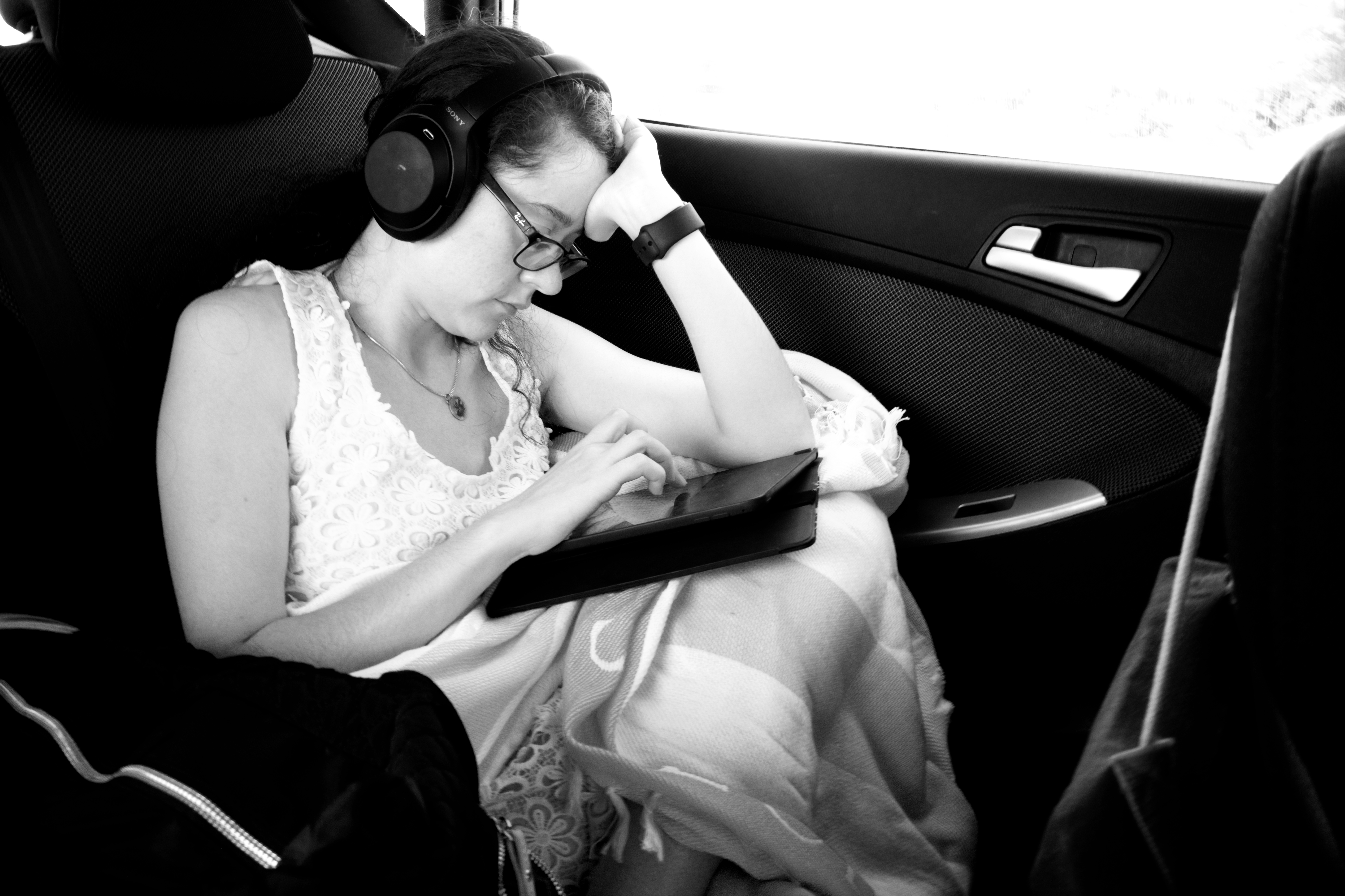 In a softly lit car interior, a young woman sits in a relaxed pose, absorbed in her tablet. Her head rests on her hand, creating an intimate moment of solitude, while a blanket drapes around her, enhancing the cozy atmosphere. The monochrome palette adds a timeless quality, emphasizing her focus and the tranquility of the journey.