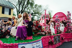 The photograph captures a vibrant parade float adorned with lush flowers, celebrating senior beauty and accomplishments. The mood is festive and uplifting, as the elegantly dressed participants, draped in sashes and beaming with smiles, exude pride and joy. Soft, diffused lighting enhances the colors, creating a cheerful atmosphere amidst the backdrop of a quaint neighborhood.