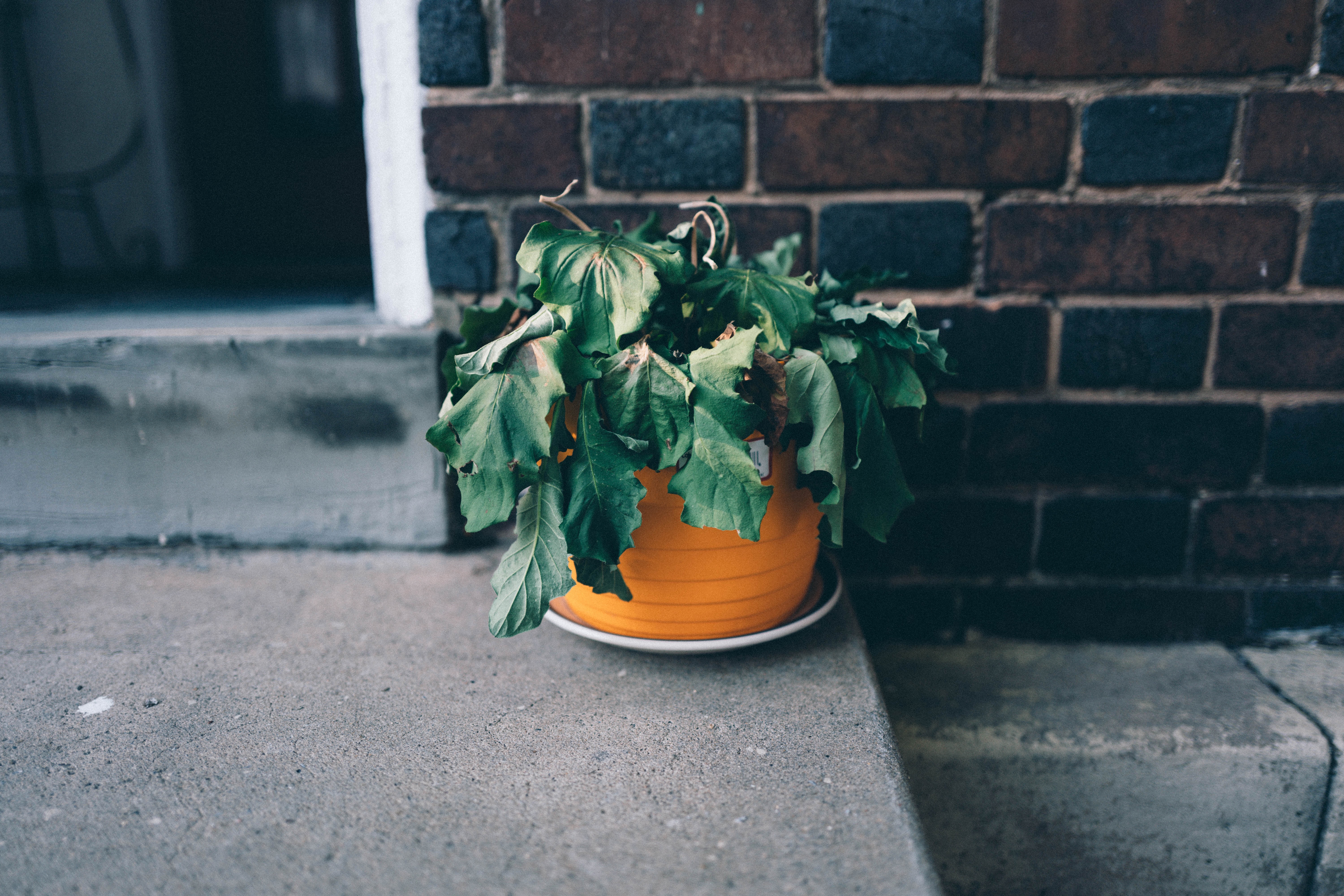 In this photograph, a once-vibrant houseplant droops in its bright yellow pot, contrasting sharply against a rustic brick wall. The soft, muted lighting highlights the plant's weary leaves, evoking a sense of neglect and wistfulness. The composition draws the eye to the poignant juxtaposition of life and decay, inviting reflection on resilience in vulnerability.