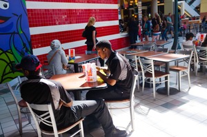 In a bustling mall food court, two young workers sit together at a table, absorbed in their own worlds while enjoying their meal. The vibrant red wall and playful mural create a lively backdrop, contrasting with the focused mood of the diners. Sunlight streams in, casting bright highlights and enhancing the casual, yet industrious atmosphere of the setting.
