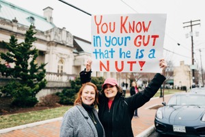 Two women stand side by side, beaming with enthusiasm as they hold a colorful sign declaring a bold message. The overcast sky casts a soft light that enhances the lively atmosphere, while the elegant architecture in the background adds a contrasting sense of formality to their spirited stance.