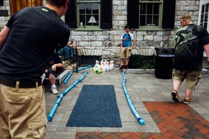 In a lively outdoor setting, a game of makeshift bowling unfolds, featuring colorful plastic pins and a soccer ball as the bowling ball. The relaxed composure of the participants, captured in mid-action, conveys a sense of camaraderie and fun. The soft, natural light enhances the playful atmosphere, drawing attention to the vibrant details of the improvised bowling lane.