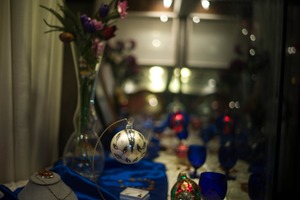 This photograph captures an elegant display of ornaments and glassware, with a striking white ball ornament suspended in mid-air, drawing the viewer's eye. The mood is serene and reflective, enhanced by the soft, ambient lighting that gently highlights the textures and colors. Rich blue fabric and deep red and blue glass create a harmonious backdrop, evoking a sense of celebration and festivity.
