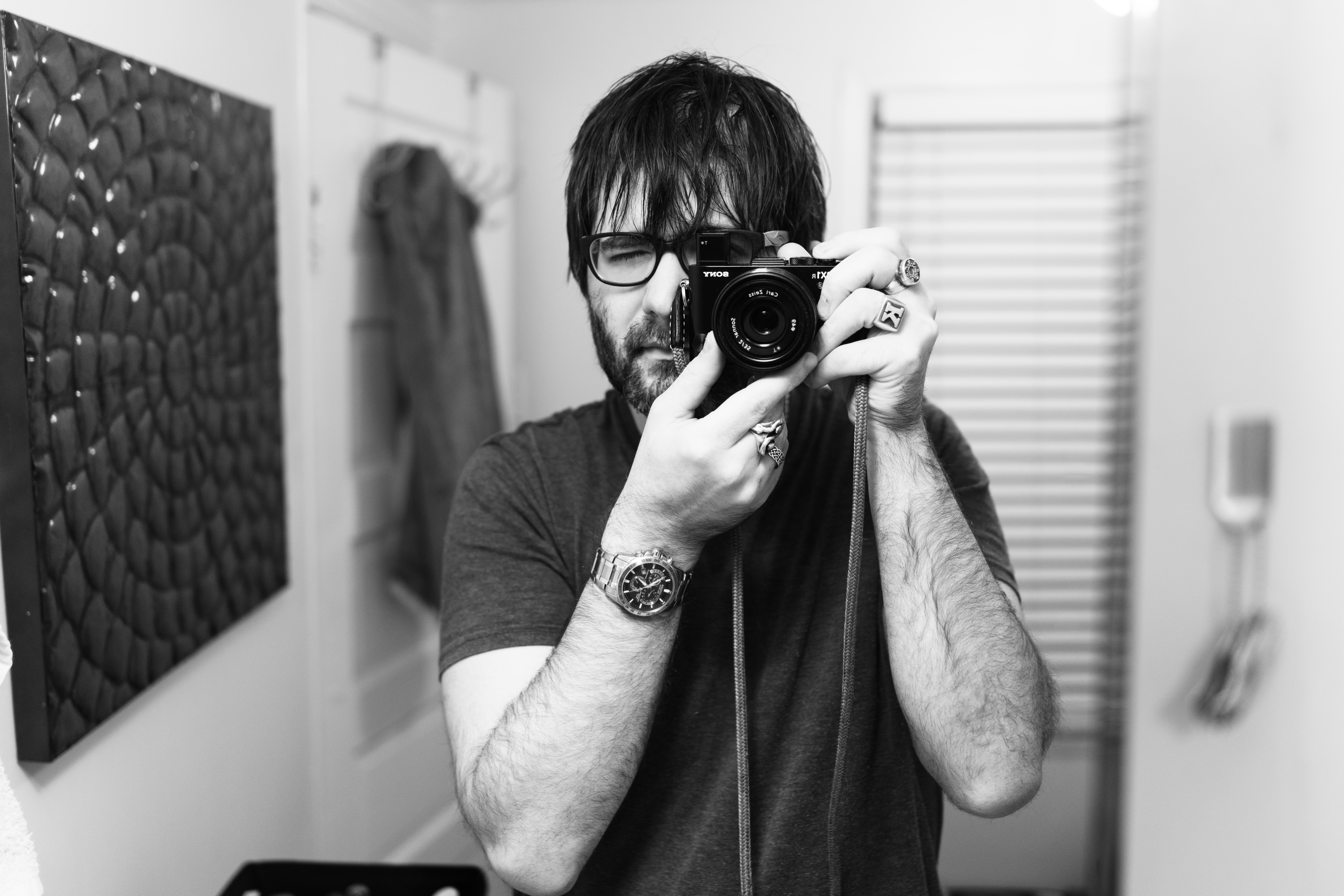 This intimate black-and-white photograph captures a man taking a self-portrait in a reflective space, embodying a moment of self-reflection and creativity. The soft lighting accentuates his contemplative expression, while the patterned wall adds texture, contrasting with the simplicity of the bathroom setting. The focus on both the man and his camera evokes a sense of connection between the artist and the art he creates.