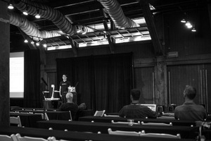 In a dimly lit room, a presenter stands confidently in front of a dark backdrop, addressing a sparse audience. The monochromatic tones emphasize a somber yet focused atmosphere, with the contrasting lights illuminating the speaker while leaving the attendees in partial shadow. The composition draws the eye to the central figure, capturing a moment of shared knowledge and anticipation in an intimate setting.