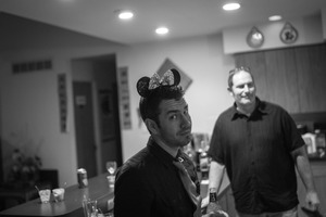 In a lively setting, a man wearing Minnie Mouse ears glances playfully at the camera, his smirk hinting at mischief. The soft lighting creates a warm ambiance, while the contrasting black and white tones amplify the casual, festive mood. In the background, a second figure stands, adding to the sense of camaraderie and celebration.