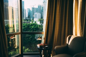 The photograph captures a cozy corner of a modern room, accentuated by warm golden hues from the sunlight streaming through the floor-to-ceiling windows. Outside, a vibrant cityscape contrasts with the serene indoor setting, creating a tranquil yet urban mood. The plush armchair and small side table invite contemplation, while hints of greenery peeking through the glass add a touch of nature to the bustling environment.