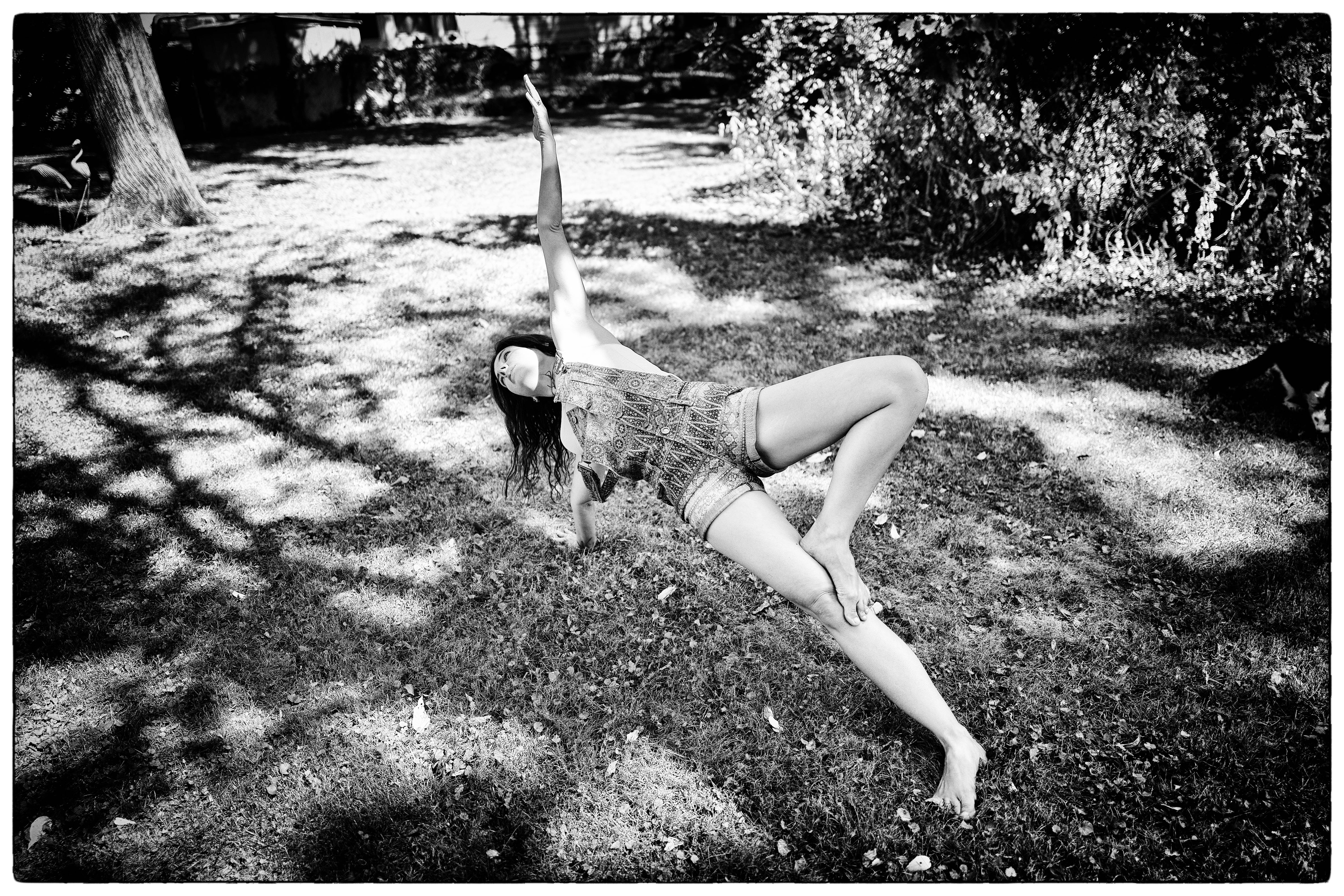 In a striking monochrome composition, a dancer gracefully arches her body on the grass, her elongated limbs reaching for the light filtering through the trees. The soft shadows cast by the foliage create an ethereal atmosphere, enhancing the sense of movement and tranquility. The contrast between light and dark highlights her form, evoking a mood of serenity and introspection in this lush, natural setting.