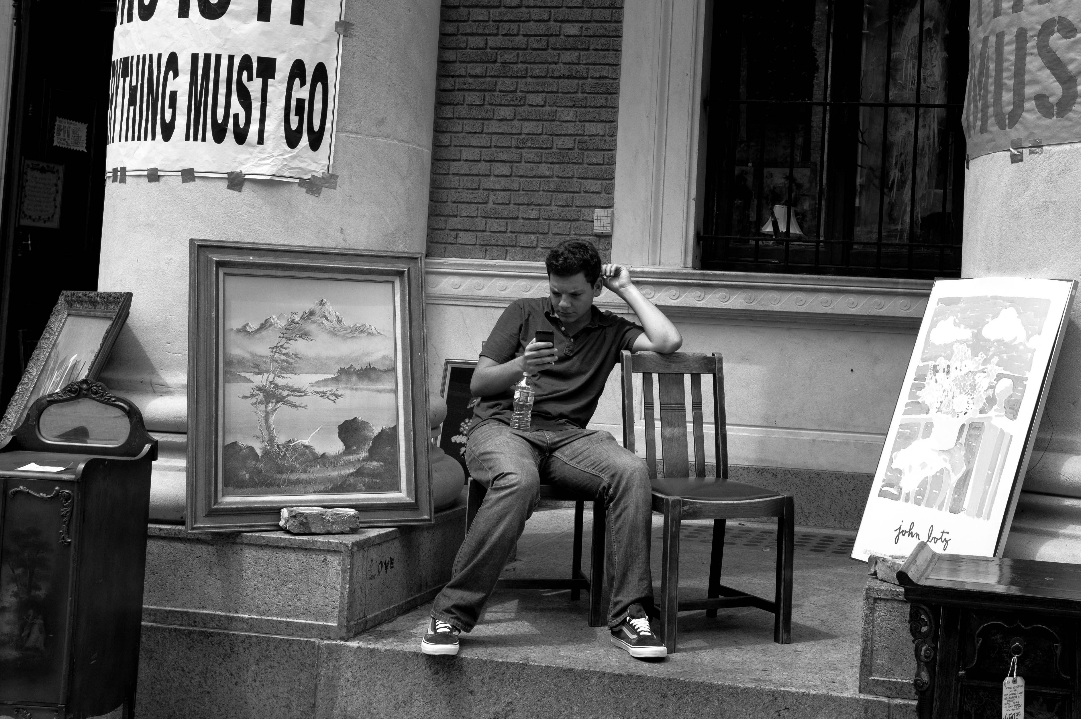 In a stark black-and-white setting, a young man sits at the edge of a bustling sidewalk, engrossed in his phone amidst the chaos of sale signs and art pieces surrounding him. The contrast of the vibrant world of art next to his solitary focus evokes a sense of introspection and detachment. Efforts to clear the space for new experiences whisper through the 'Nothing Must Go' banner overhead, symbolizing transition and the bittersweet nature of change.