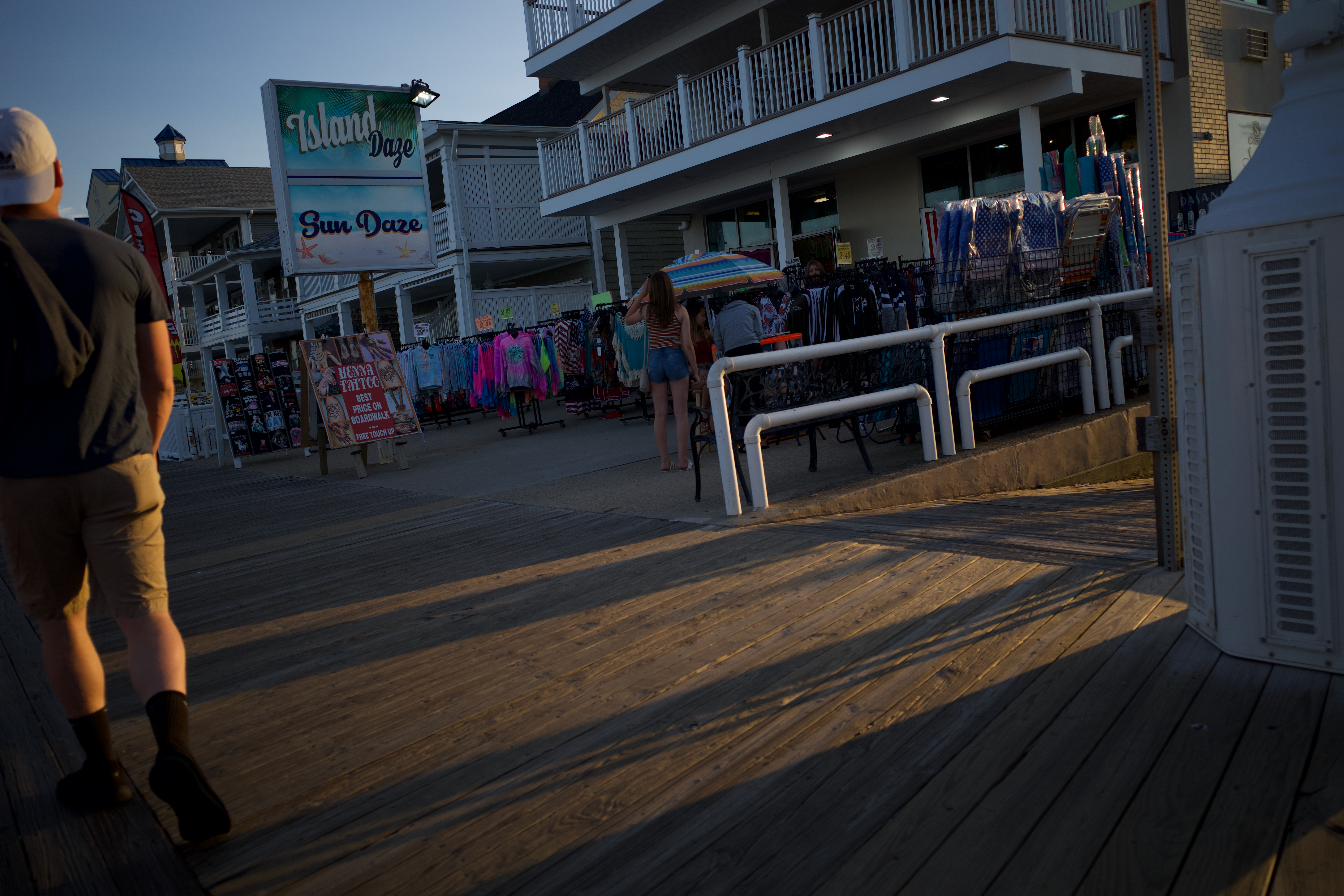 The photograph captures a serene moment on a bustling boardwalk, gently illuminated by the warm glow of the setting sun. In the foreground, a person walks away, while groups of people browse vibrant beach attire and souvenirs, creating a sense of leisurely summer life. The composition balances the lively storefronts with the relaxed atmosphere, showcasing a blend of activity and tranquility.
