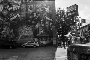 This black-and-white photograph captures a dynamic urban mural filled with figures and intricate designs, creating a vibrant backdrop against a street scene. The contrasting light highlights the mural's details while casting shadows on the surrounding cars and buildings, evoking a sense of cultural depth and community. The composition is grounded by the mix of everyday urban elements, merging artistry with daily life in a striking visual narrative.
