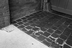 This striking black-and-white photograph captures a fractured stone pathway leading to a weathered door, evoking a sense of nostalgia and abandonment. The interplay of shadows and light accentuates the unevenness of the stones, while the subtle textures of the brick wall add depth to the composition. The somber mood is heightened by the stark contrasts, inviting viewers to ponder the passage of time and the stories held within this quiet entrance.
