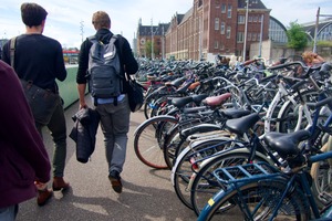 The photograph captures two figures walking among an intricate labyrinth of parked bicycles, showcasing the bustling energy of urban life. The lighting is bright and inviting, casting soft shadows that enhance the textures of the bikes and pavements. The scene evokes a sense of community, movement, and the everyday rhythm of city living, framed by distinctive architectural elements in the background.