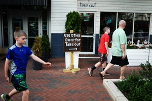In this candid street scene, a man and two boys stroll past a restaurant, framed by vibrant greenery and a playful 'take out' sign. The mood is casual and relaxed, hinting at a warm day, while the composition balances movement and stillness, drawing the eye toward the welcoming entrance. Soft natural light bathes the scene, enhancing the inviting atmosphere of this everyday moment.