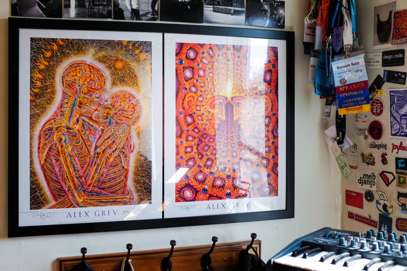 Two vibrant Alex Grey prints adorn the wall, showcasing intricate depictions of human connection and consciousness. The warm hues of orange and red evoke a sense of passion and enlightenment, while soft natural light subtly illuminates the artworks. Surrounding objects and the cluttered backdrop add a touch of personal warmth, enhancing the intimate mood of the scene.