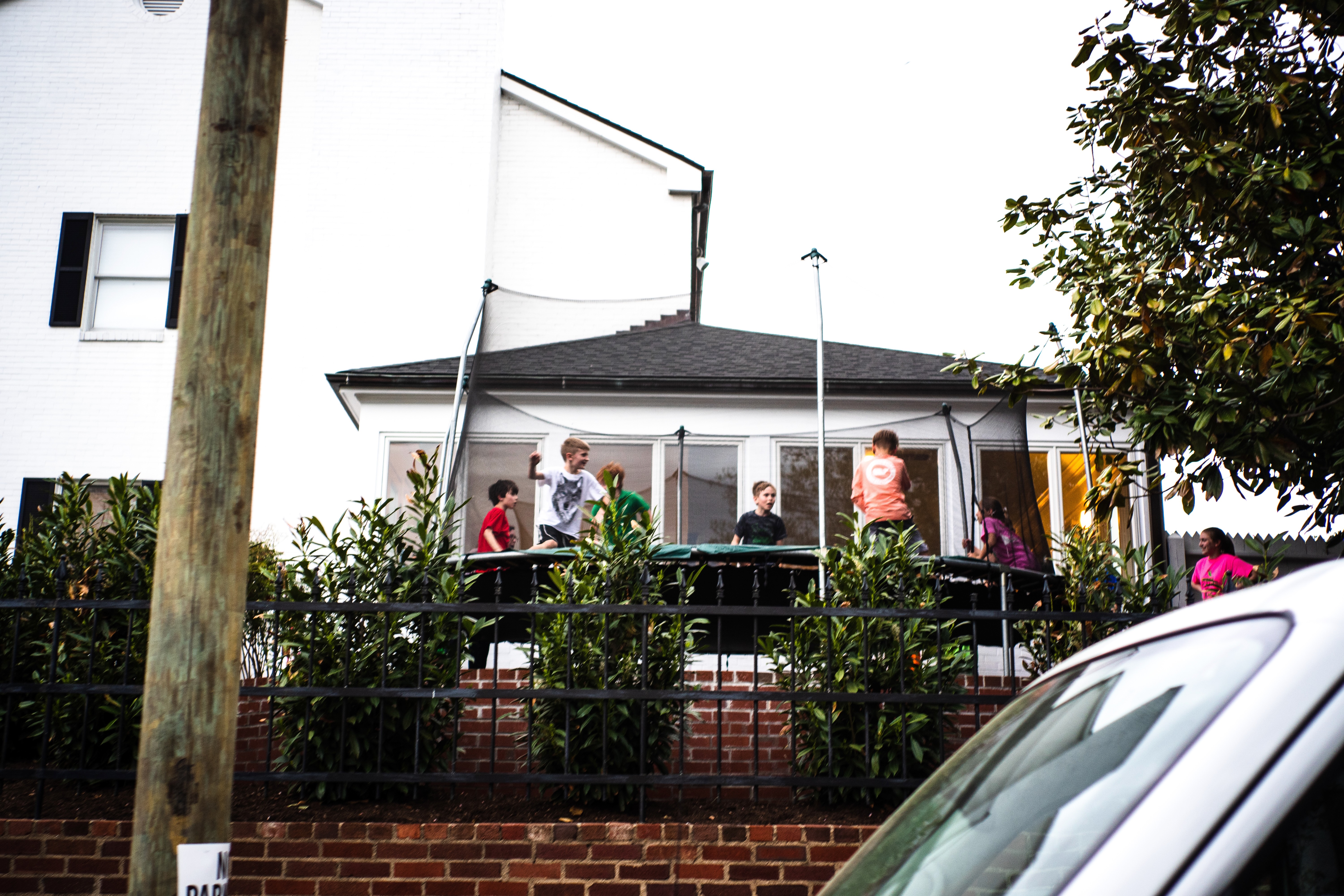 The photograph captures a lively scene of children bouncing on a trampoline, framed by the warm glow of a home in the background. The overcast sky lends a subtle grayness to the mood, while the greenery and brick walls create a sense of cozy suburban familiarity. The composition draws the eye to the joyful energy of the kids, contrasting with the stillness of the surrounding environment.