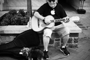 An older man plays a soft tune on his acoustic guitar, seated casually against a stone wall. The black-and-white composition adds a nostalgic mood, while the light filters gently through the surroundings, enhancing the serene ambiance. A small dog rests near the musician, sharing in the tranquility of the moment.
