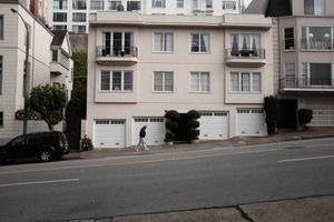 The photograph captures a lone figure walking along a sloped street, flanked by a row of softly hued residential buildings. The muted, overcast lighting casts a reflective mood, highlighting the quiet solitude of the scene, while the manicured bushes add a touch of greenery against the stark architecture. The composition emphasizes the horizontal lines of the street and buildings, drawing the eye toward the distant urban backdrop.
