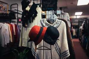 The photograph captures two stylish hats—a vibrant red one and a classic black one—sitting prominently on a display stand, drawing the viewer’s eye. Soft, ambient lighting enriches the cozy, vintage atmosphere of the clothing store, highlighting the textures of the surrounding garments. The composition suggests a warm and inviting shopping experience, blending elements of fashion and nostalgia.