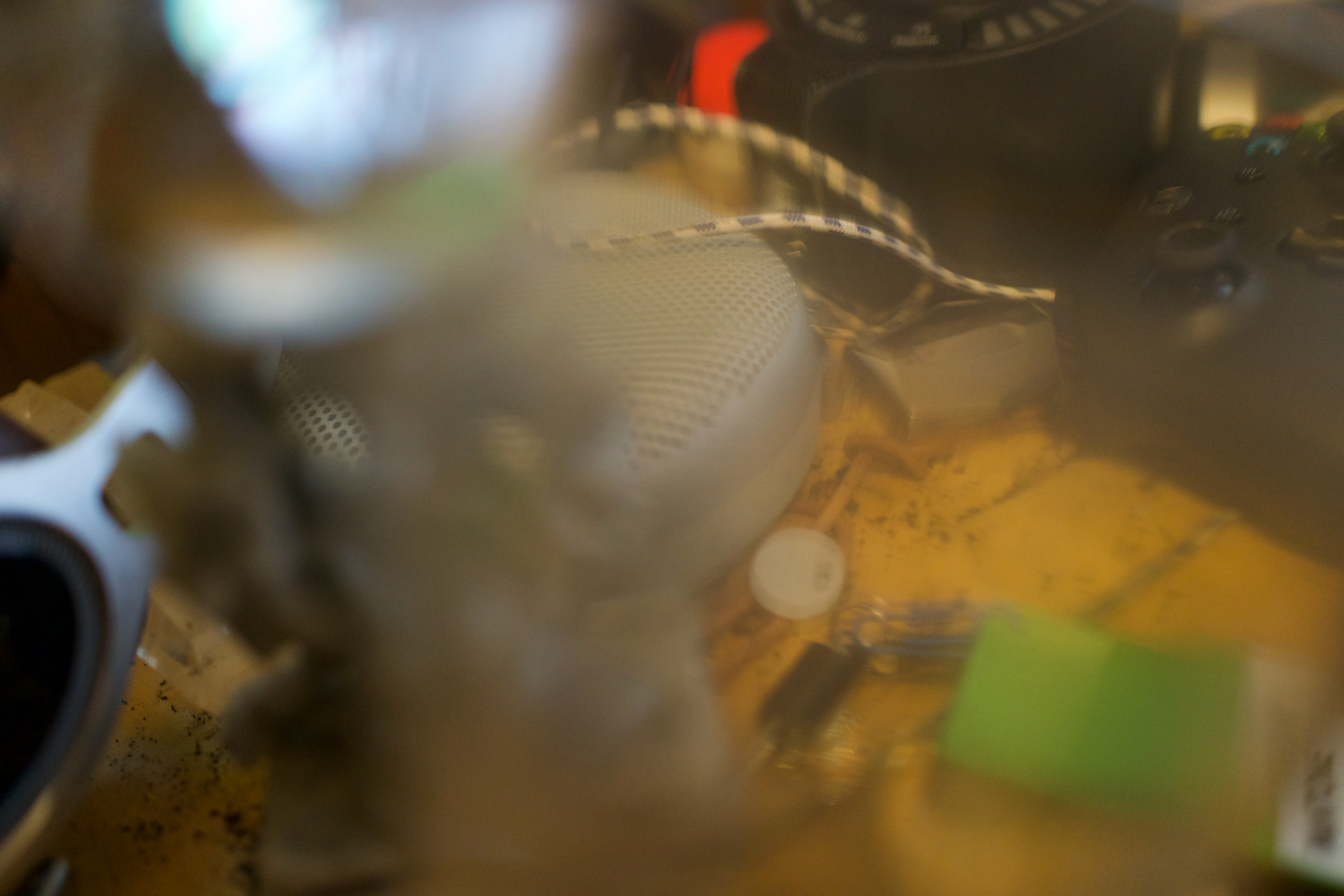 This photograph captures a cluttered workspace, shrouded in a veil of blur that adds an air of mystery to the scene. Various objects, including a gaming controller and speakers, peek through the haze, evoking a sense of disarray yet personal warmth. The lighting is soft, casting gentle shadows that enhance the sense of depth within the chaotic composition.