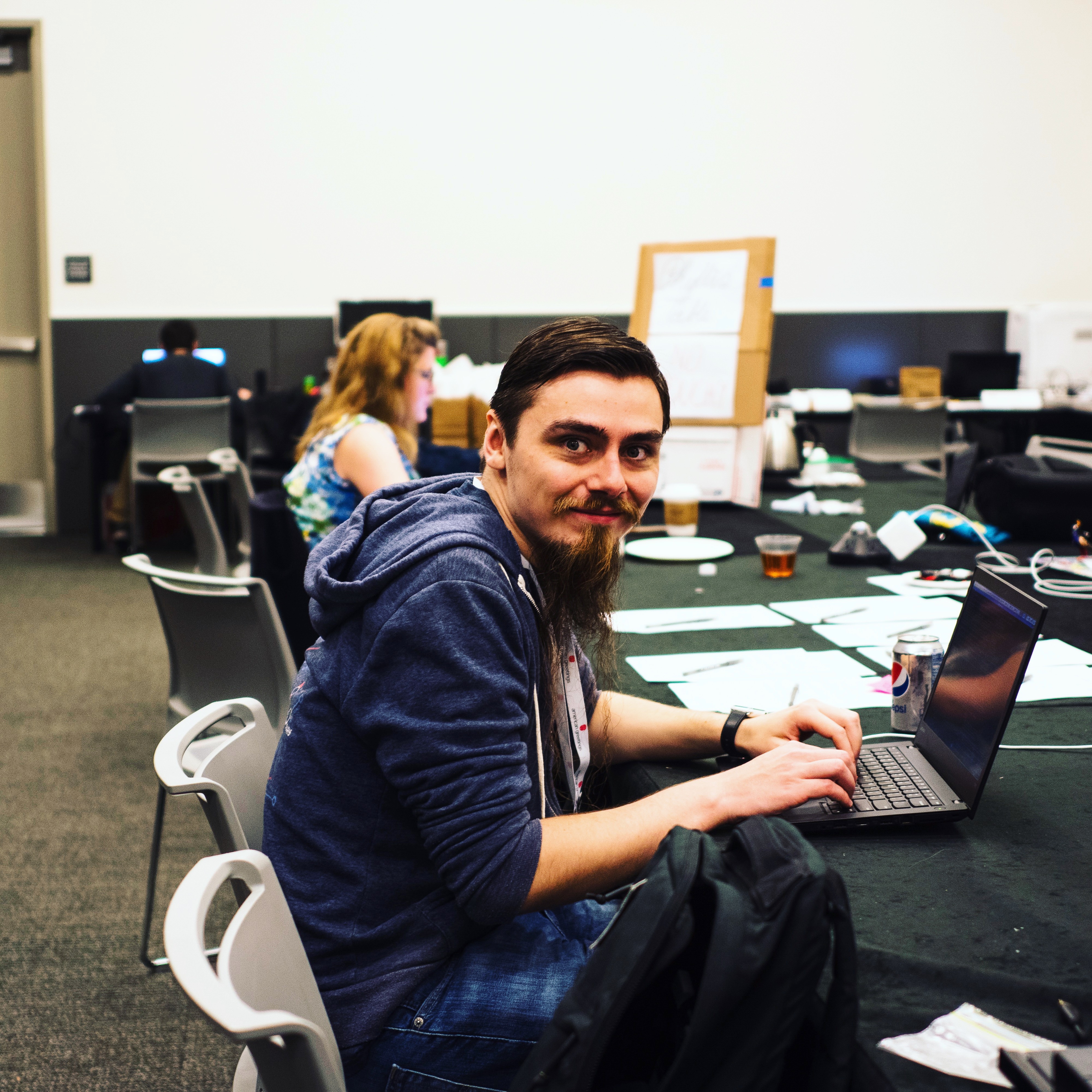 In a bustling workspace, a man sits intently at his laptop, a slight smile on his face that conveys both engagement and a sense of calm. The soft lighting adds warmth to the scene, while the scattered papers and a casual atmosphere hint at creativity in progress. In the background, another individual works diligently, creating a sense of community amidst productivity.