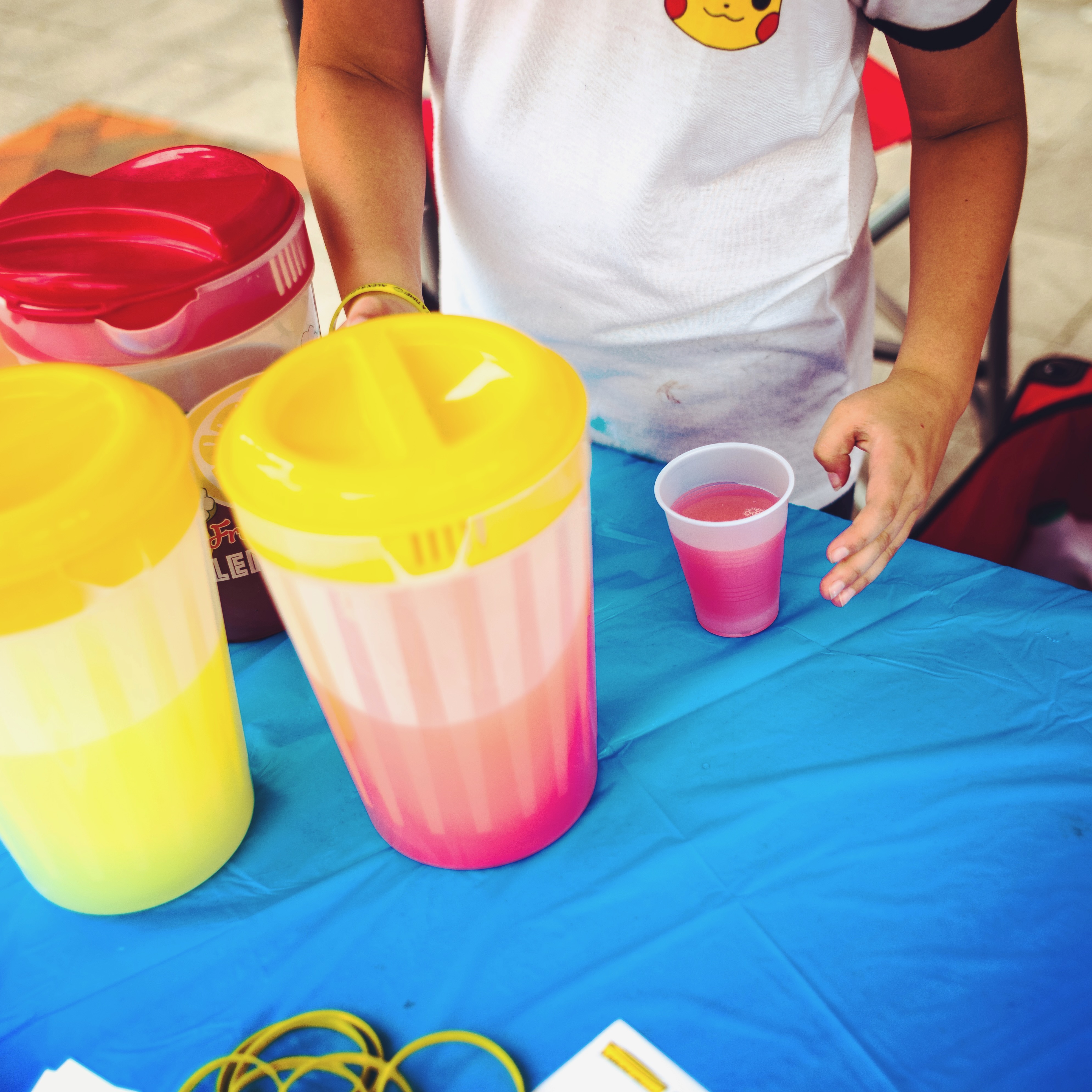 A vibrant scene captures a hand pouring a colorful drink from a yellow-striped pitcher into a pink cup, set against a bright blue tablecloth. The playful color contrasts and casual summer atmosphere evoke a sense of joy and refreshment, inviting nostalgia from sunny days. The warm, natural lighting enhances the cheerful mood, highlighting the simplicity of a shared moment.